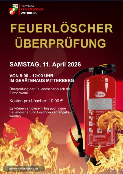 Überprüfung der Feuerlöscher durch die Firma Waibl Kosten pro Löscher: € 10,00 Es können an diesem Tag auch neue Feuerlöscher und Löschdecken angekauft werden